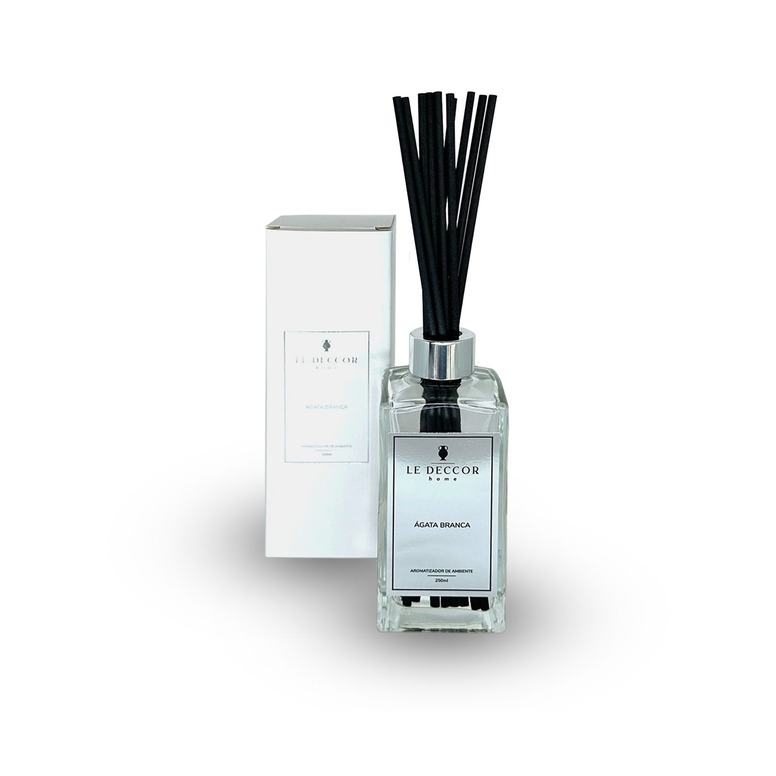 A embalagem de vidro elegante, com detalhes prateados, complementa a decoração de ambientes modernos e luxuosos. O conjunto acompanha 10 varetas em fibra de bambu, que garantem uma difusão uniforme e constante da fragrância, proporcionando uma experiência olfativa agradável por muito mais tempo.