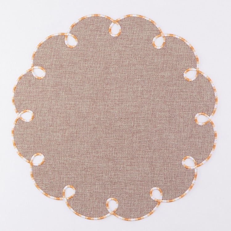 Produzido em poliéster de alta qualidade, tem toque macio, excelente durabilidade e manutenção simples. O design orgânico, com bordas scalloped e vazados circulares, ganha destaque com o viés bicolor amarelo e branco que contorna toda a peça, criando um efeito delicado, moderno e fotogênico.