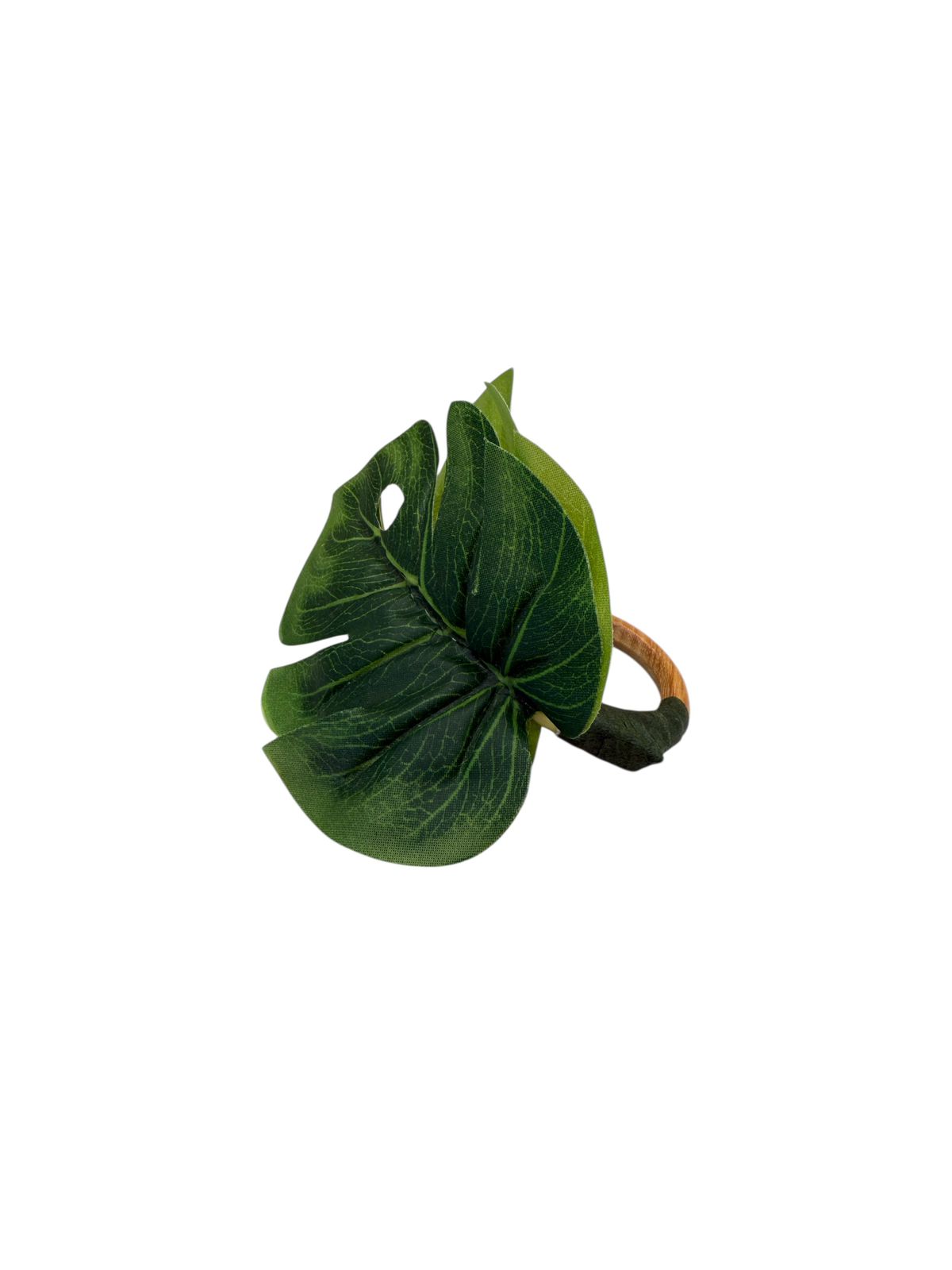 Praticidade e estilo na sua mesa com o anel de guardanapo em formato de folha de costela de adão. Ideal para organizar guardanapos com charme.