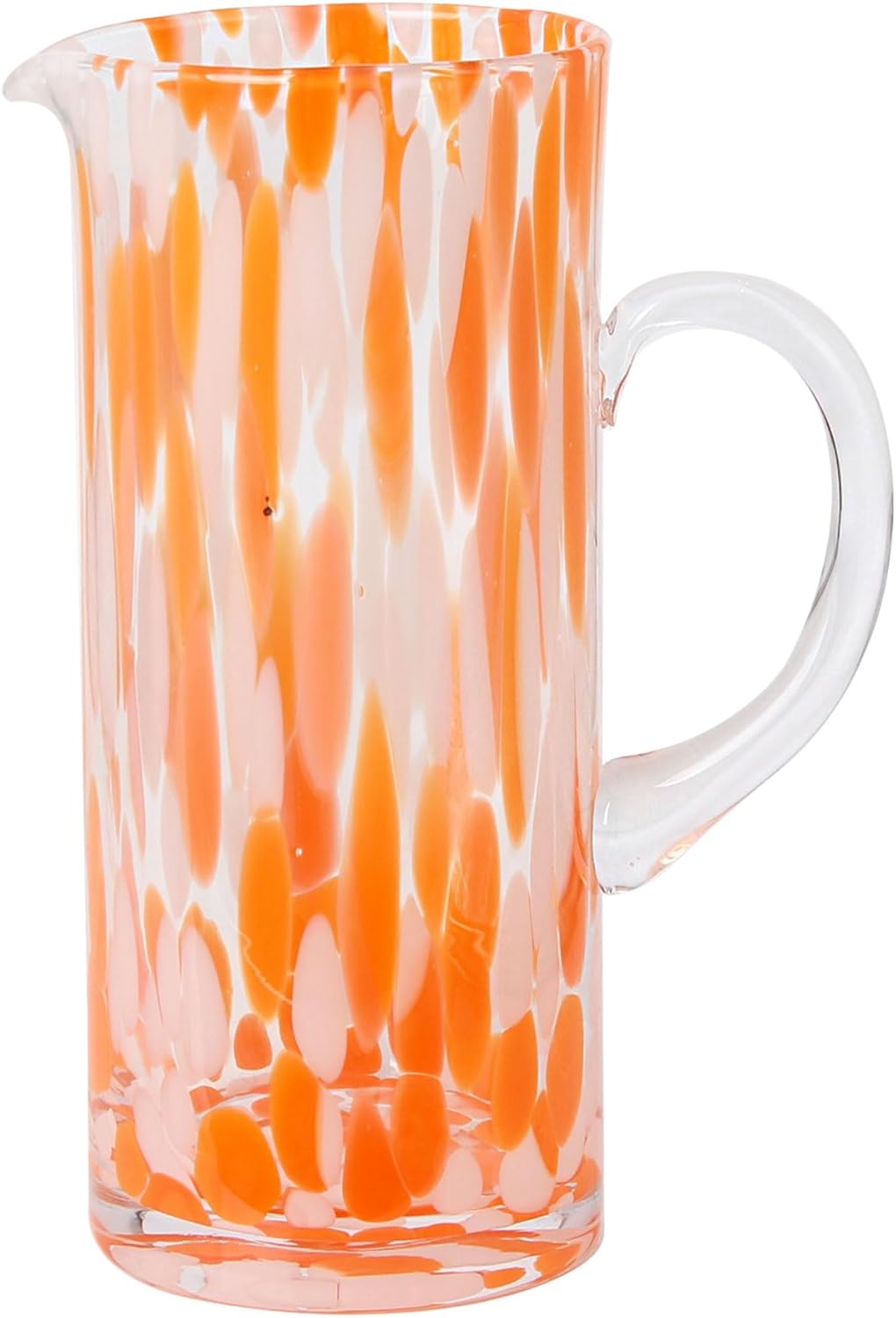 A jarra é feita em vidro com pintura estilo aquarelada nas cores laranja e branco, combinando resistência com uma aparência artística e alegre. Mede cerca de 23 cm de altura e possui formato cilíndrico com bico para melhor fluxo.