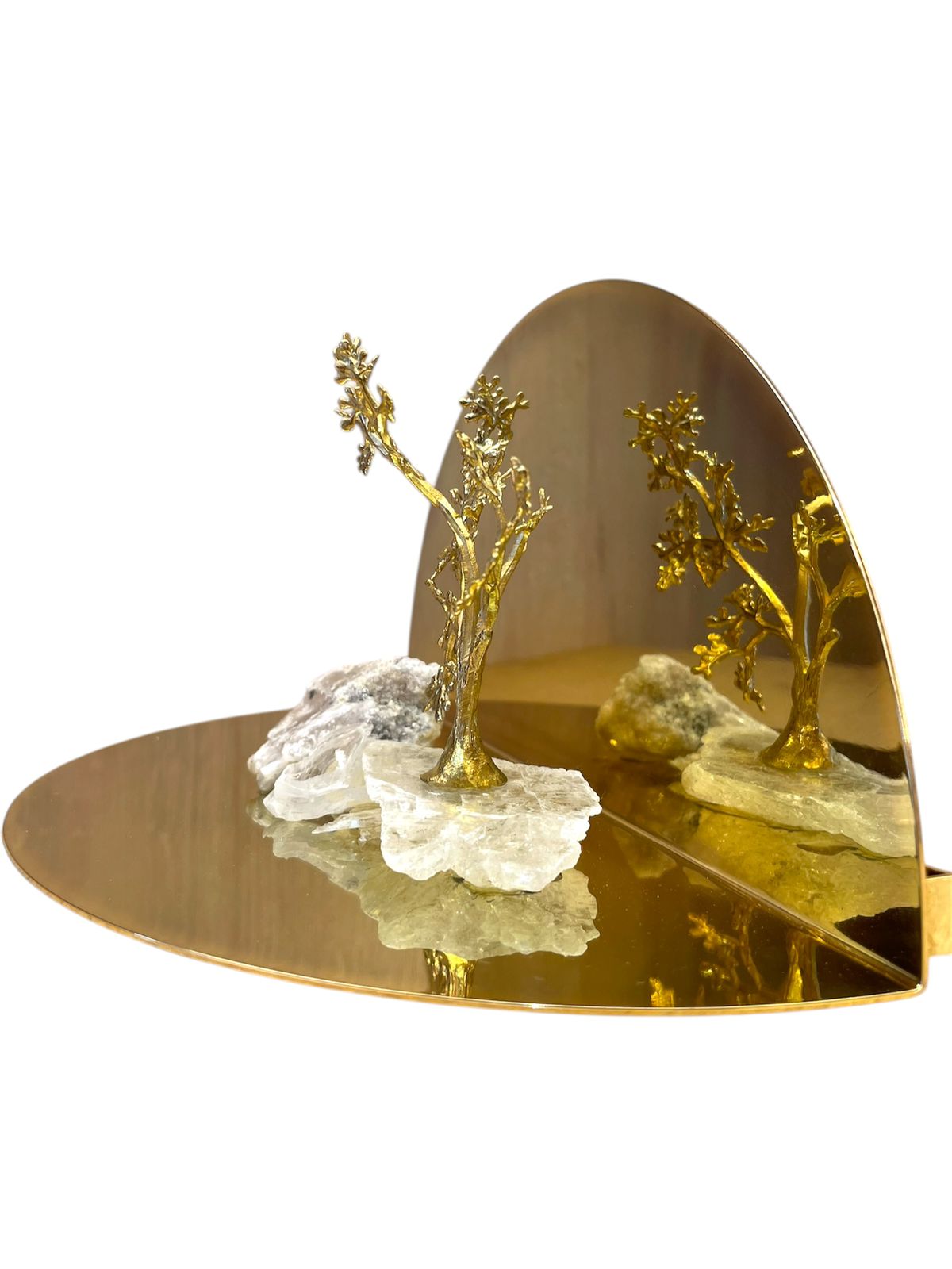 MATERIAL:• cenário com pedra selenita, arvorezinha P em bronze fundido, e estrutura banhados a ouro