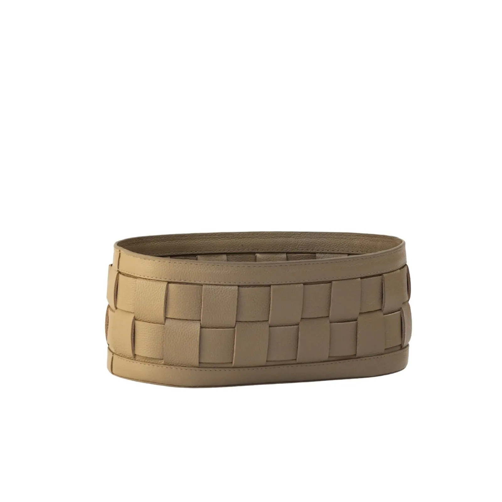 O cesto é confeccionado em couro legítimo com trançado manual, o que confere durabilidade e toque natural ao produto. Seu design em formato oval gera facilidade no encaixe em diversos espaços. Ideal para uso interno, em diferentes ambientes da casa, como sala, quarto e banheiro.