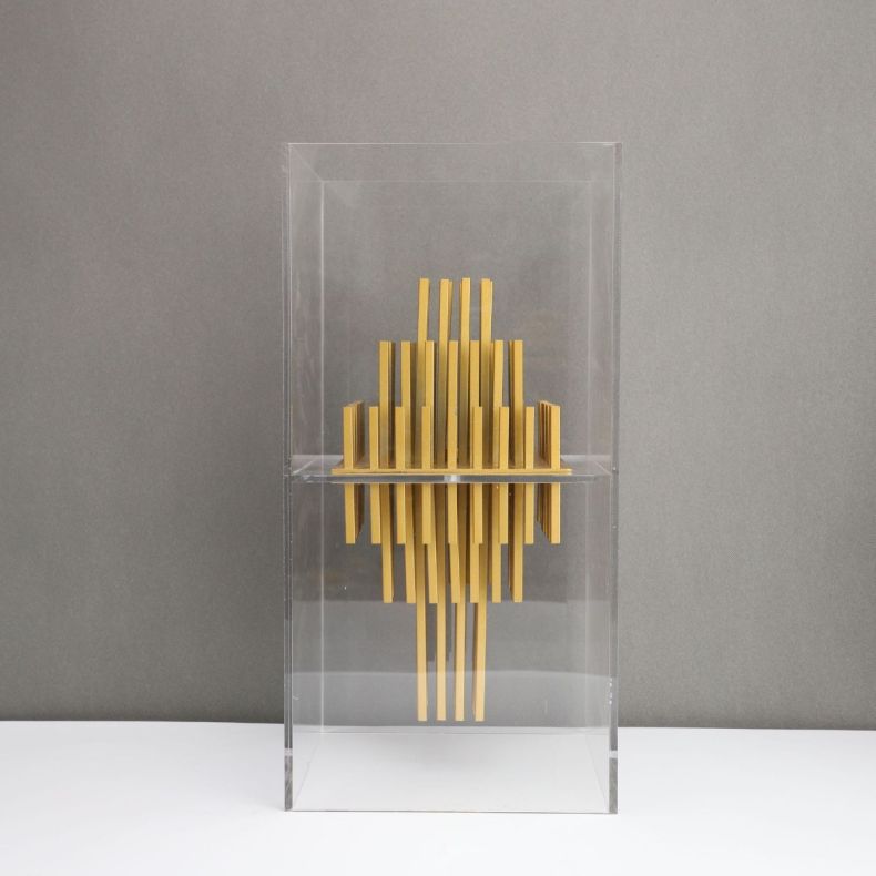 A escultura é feita inteiramente em acrílico, com acabamento transparente e detalhes dourados em formato geométrico no centro. Suas dimensões são 20 cm de largura, 20 cm de profundidade e 40 cm de altura. Ideal para quem procura uma peça decorativa que une arte e modernidade.