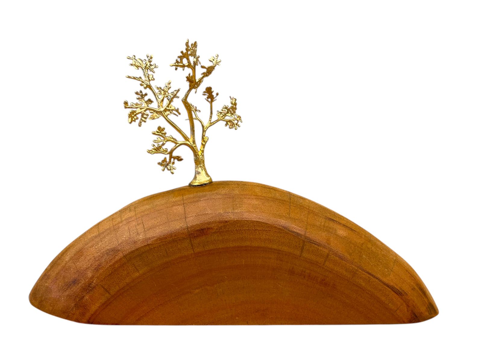 MATERIAL: esculturas em madeira de troncos rachados e metal banhado a ouro (troncos tamanhos variados / metais, arvore e folha)