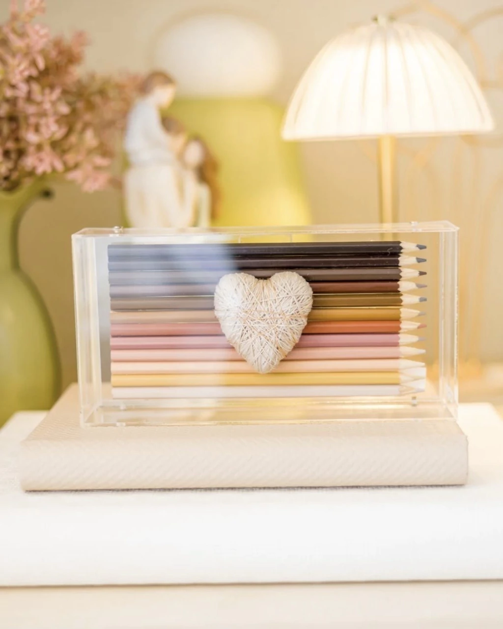 Uma peça decorativa única que adiciona charme e estilo ao seu ambiente. A escultura traz uma combinação delicada de lápis coloridos com um coração neutro no centro, perfeita para quem gosta de detalhes especiais e personalidade na decoração.