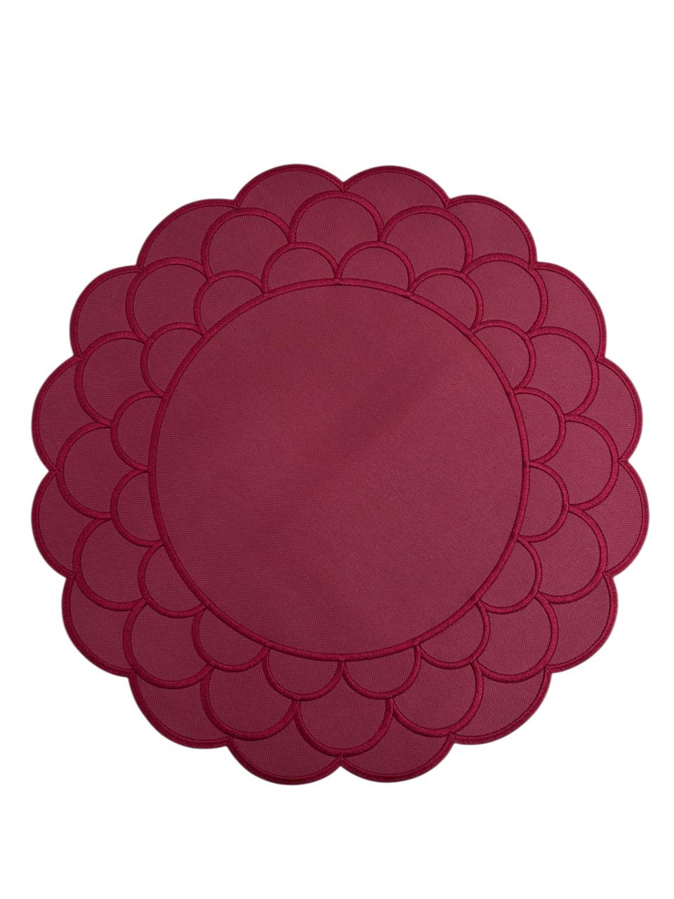 Kit com 2 jogos americanos em tom bordô, formato arredondado com bordas recortadas em formato de flor. Ideal para proteger a mesa e dar um toque decorativo elegante e sofisticado.