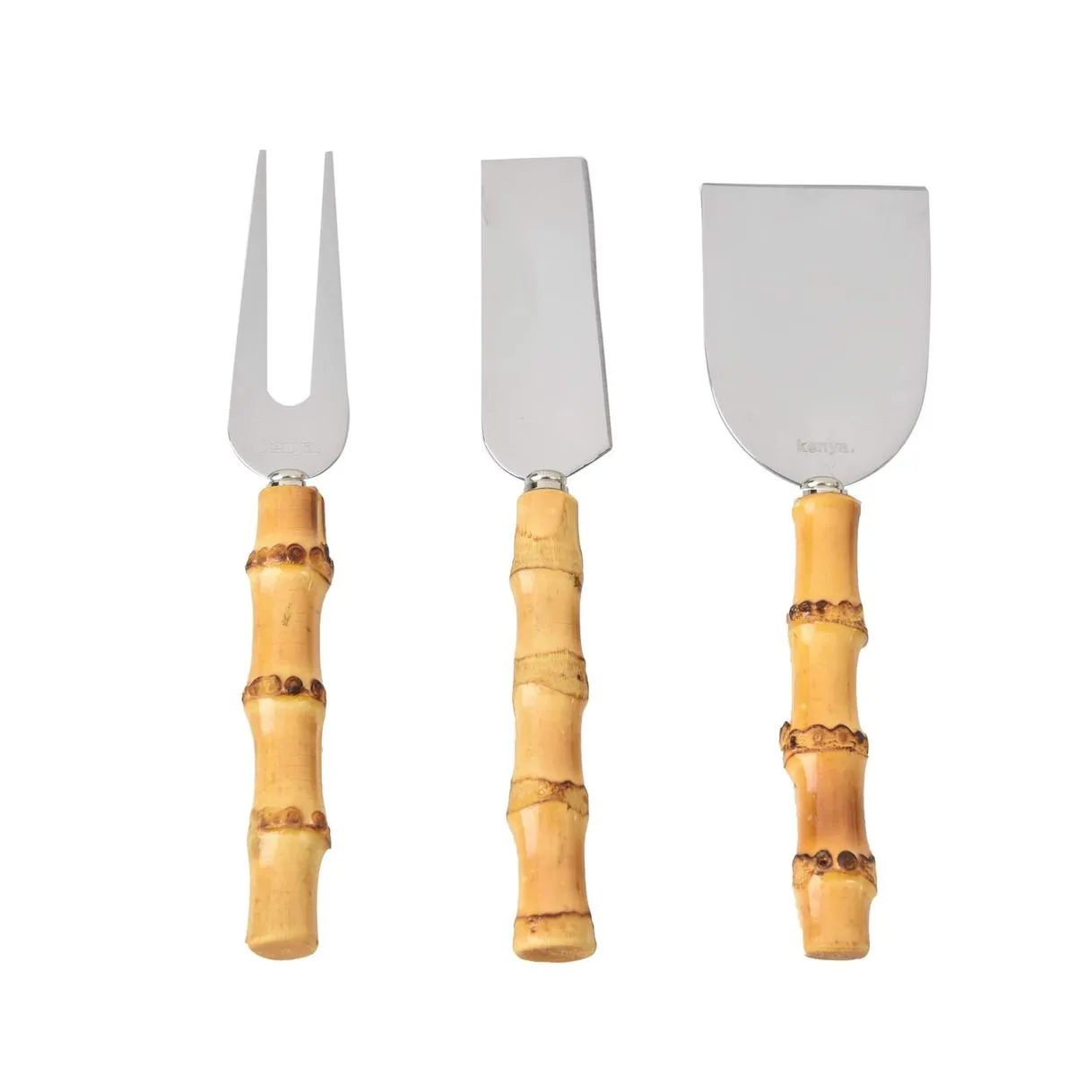 O kit inclui 3 peças: um garfo, uma faca corta-queijo e uma espátula, todas com cabo em bamboo natural e lâminas em aço inox.