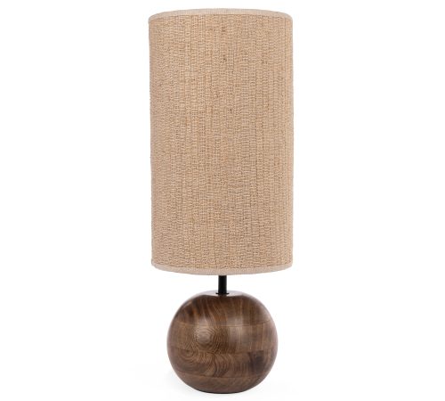 A estrutura é composta por uma base arredondada em madeira com acabamento natural, que complementa a cúpula cilíndrica feita em tecido de juta, oferecendo resistência e beleza ao produto. O design combina com diversos estilos de decoração, especialmente os que valorizam materiais naturais e aconchegantes.