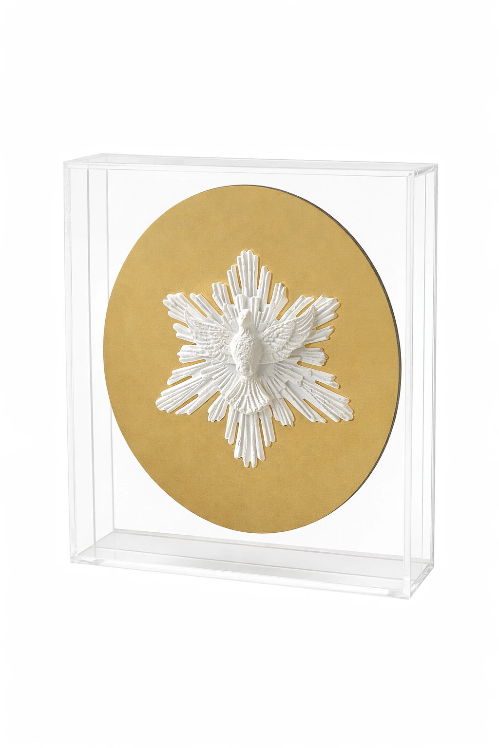 Uma peça religiosa detalhada para decorar e trazer espiritualidade ao ambiente. A medalha de 15x15x4cm apresenta um design elegante com o Espírito Santo e a oração do Pai Nosso gravada.